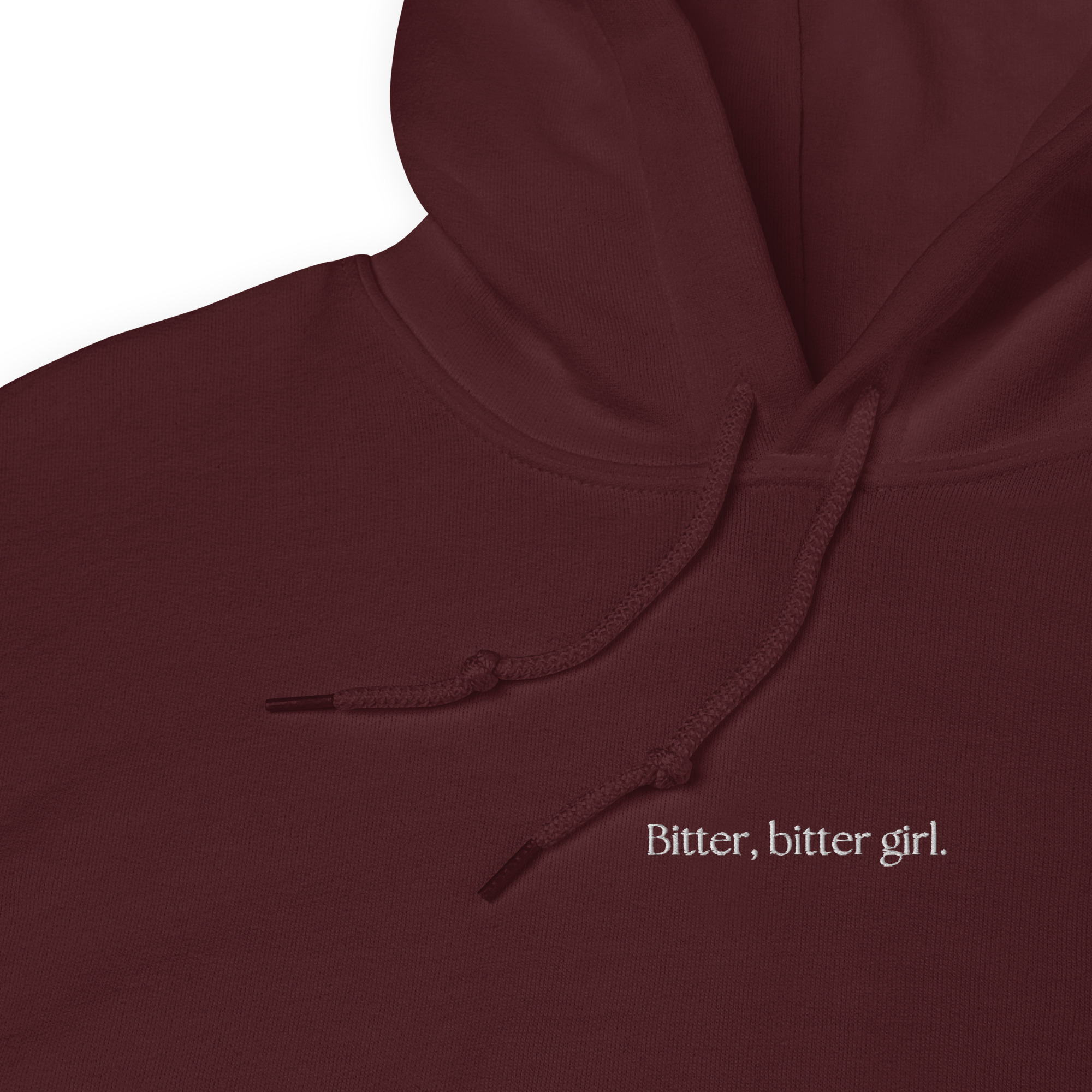 Embroidered Morwena hoodie with words ‘Bitter, bitter girl.’ Part of The Wild Kingdom Collection.